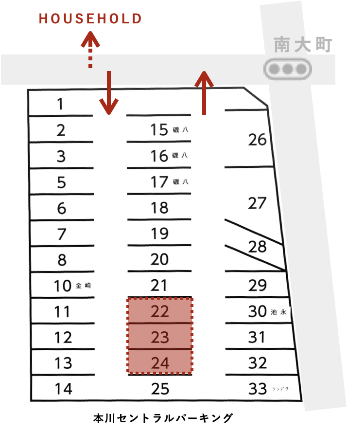 HOUSEHOLDの宿泊者用駐車場として、店舗前の駐車場(本川セントラルパーキング)の3台分[22],[23],[24]をご用意しています。