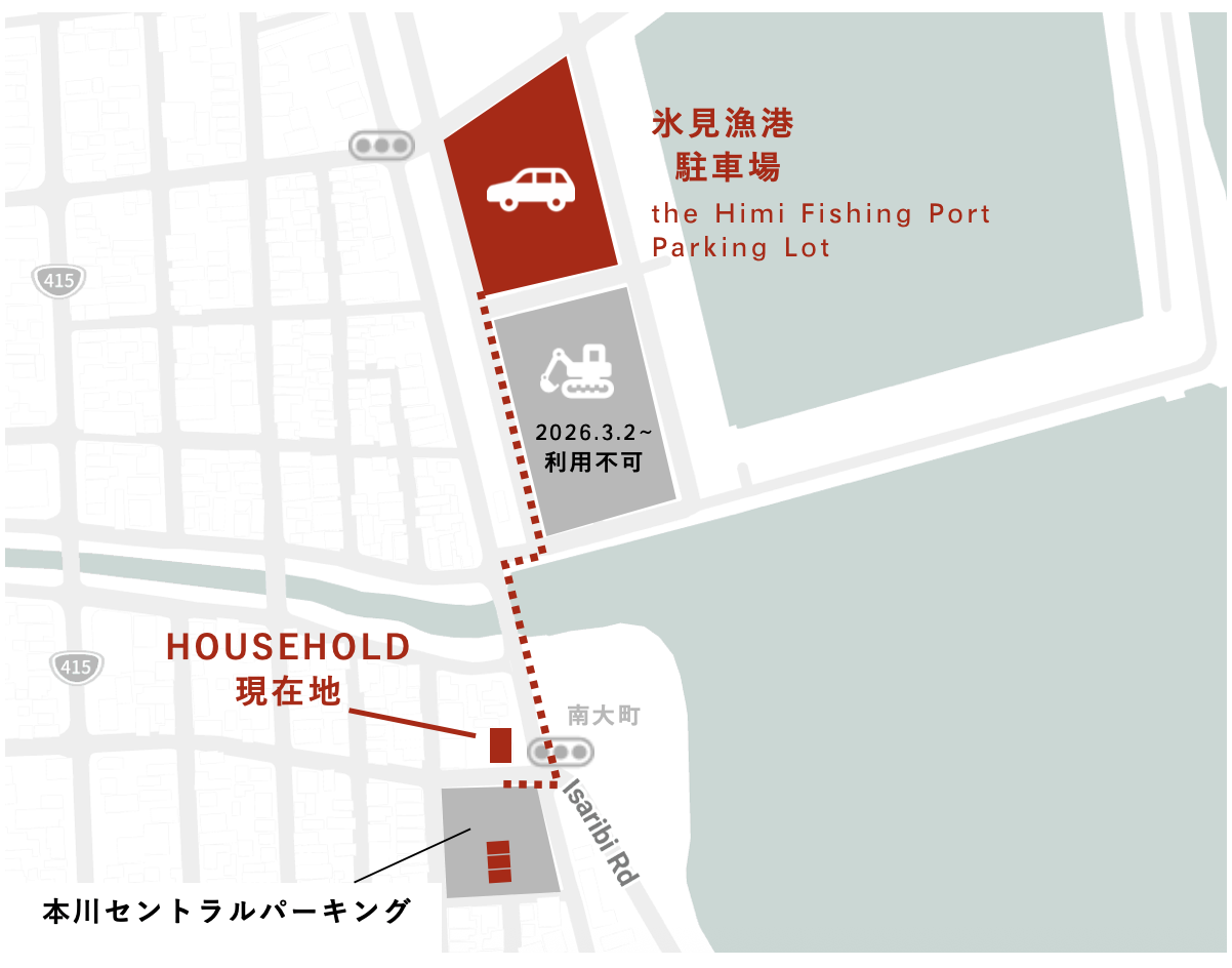 Guests visiting HOUSEHOLD are welcome to use the Himi Fishing Port [Himi Gyoko 氷見漁港] Parking Lot (a free public parking area, about a 3-minute walk from HOUSEHOLD).